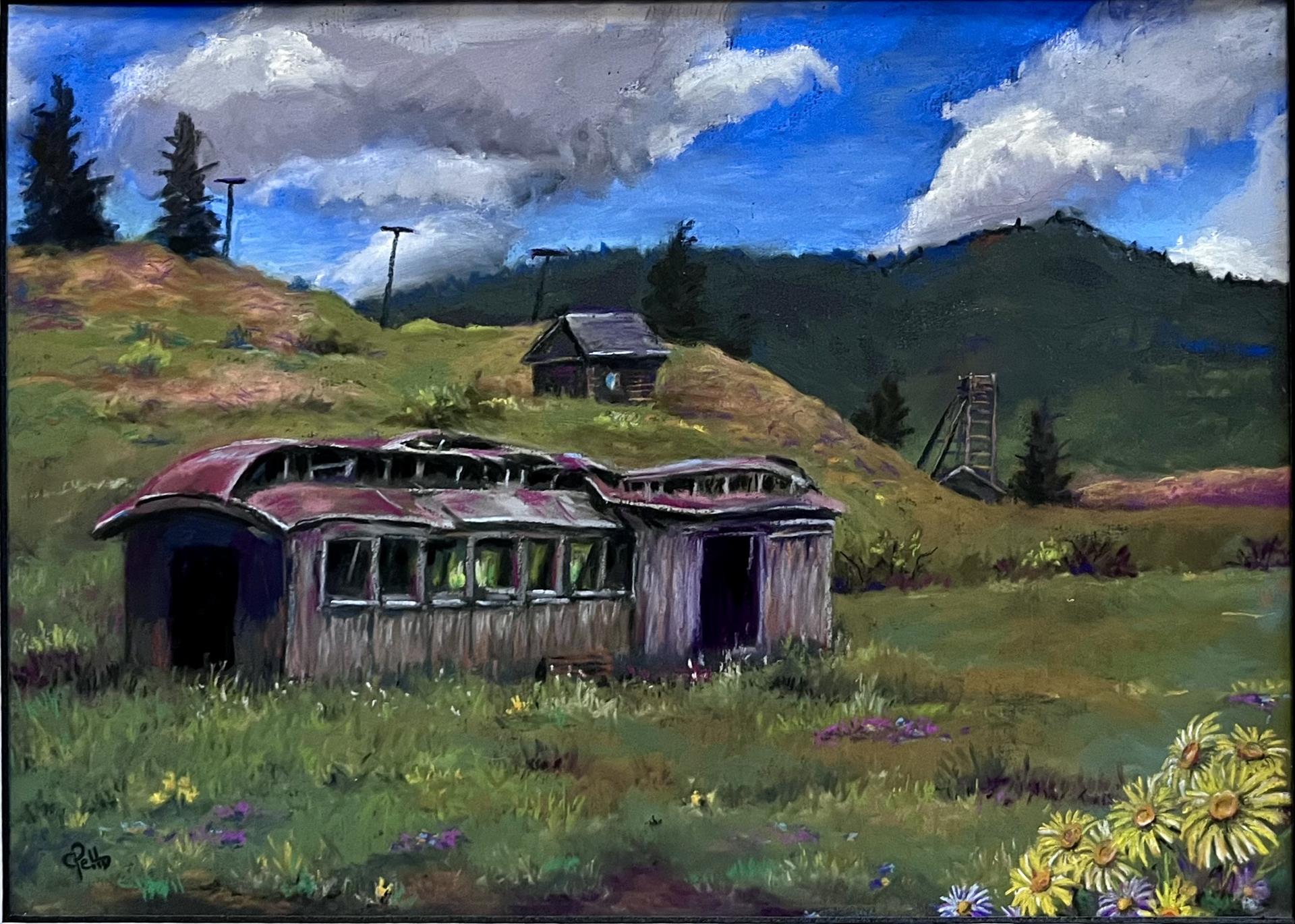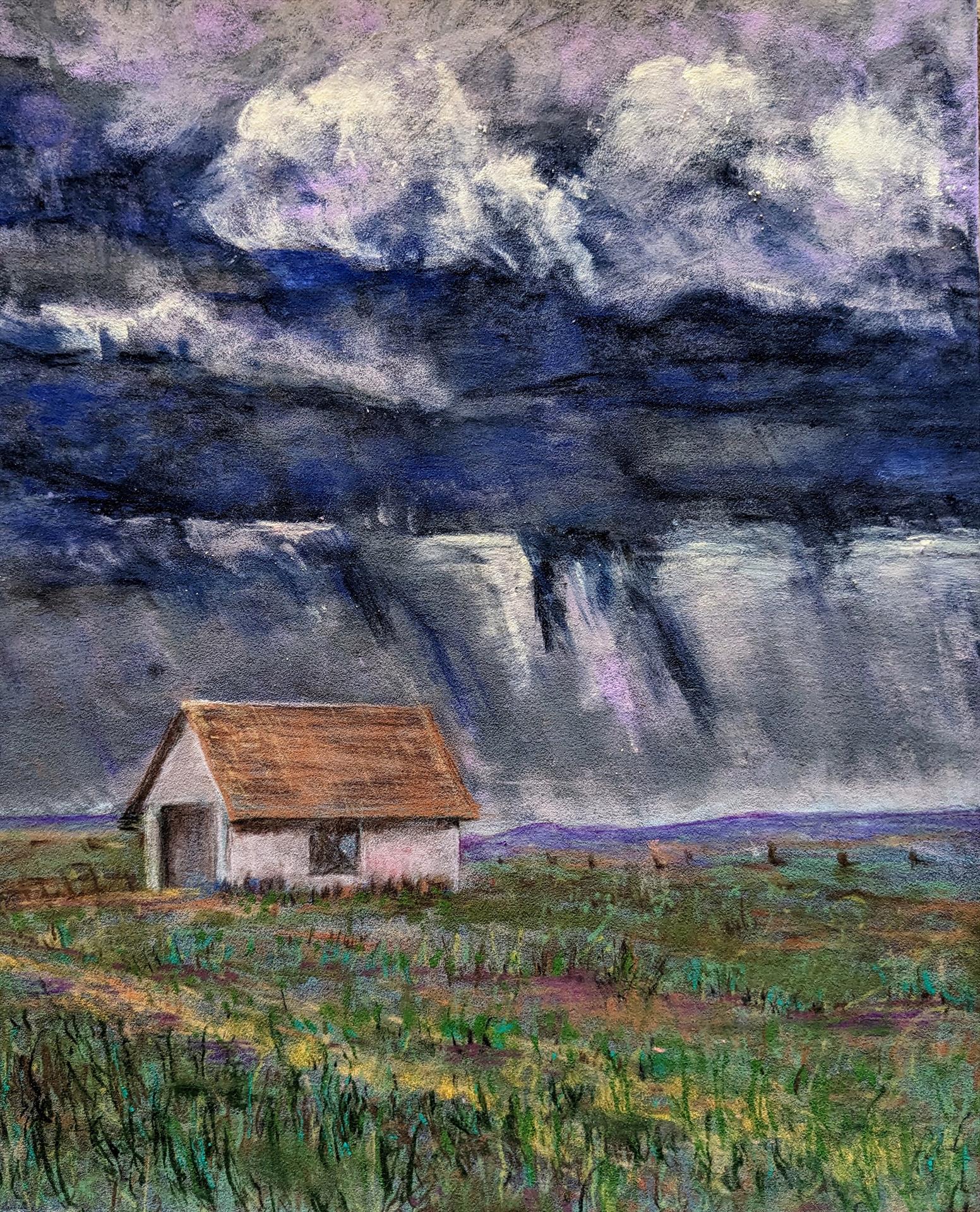 Like the high horizon line, giving a feeling of vast space and loneliness. The painting has a strong emotional component. A great variety of shapes. It is overall nicely done. Like how the posts are situated in the background; arranged almost musically.