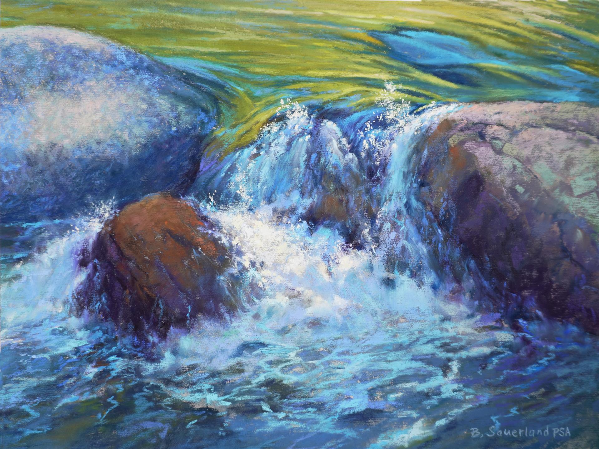 Painting is very fresh with splashes of color; directional movement of the water is well done. The movement of light and dark in the rocks is nice with contrasting warm and cool colors. The high key colors of the rocks are quite nice.